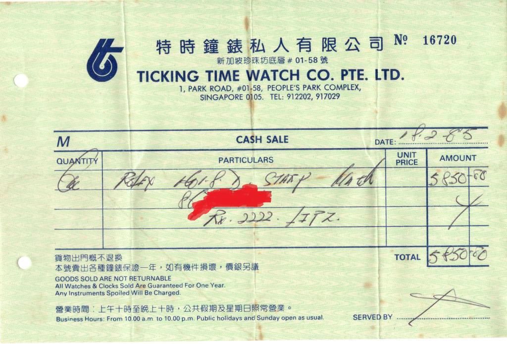 The above fig 24 shows the original purchase receipt when my Father bought the watch back in 1985 at $5,850.80, a discount of around 31% from the Retail Price of $8,549.00 then.