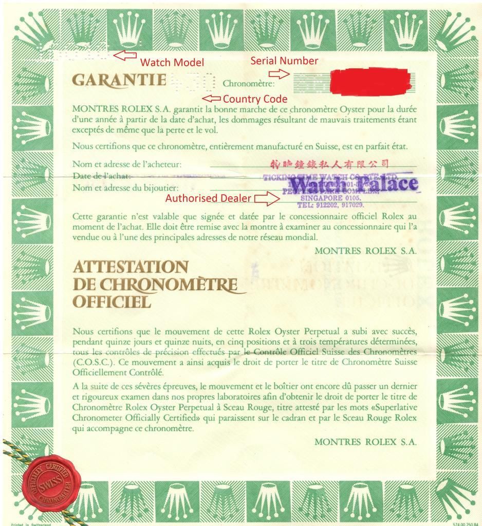 - For every country that Rolex has an Authorized Dealer, Rolex would assign a particular Country Code to differentiate the countries. Like an example, the paper shows 430 which is Singapore, Hong Kong is 888, Germany is 100 and etc.